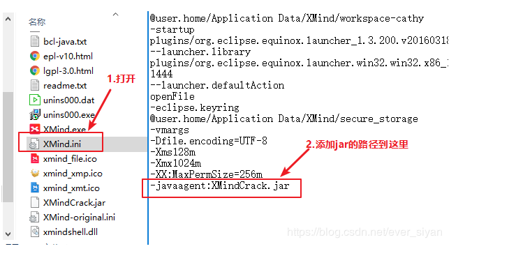 打开安装目录下的XMind.ini配置文件,在末尾添加一行【-javaagent:XMindCrack.jar】(此项是jar文件的文件路径,按自己所放路径写)