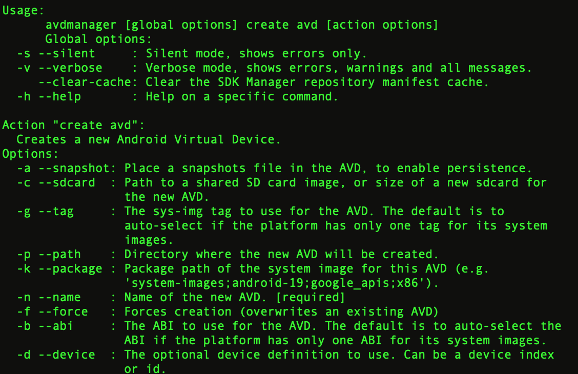 avdmanager [global options] create avd [action options]