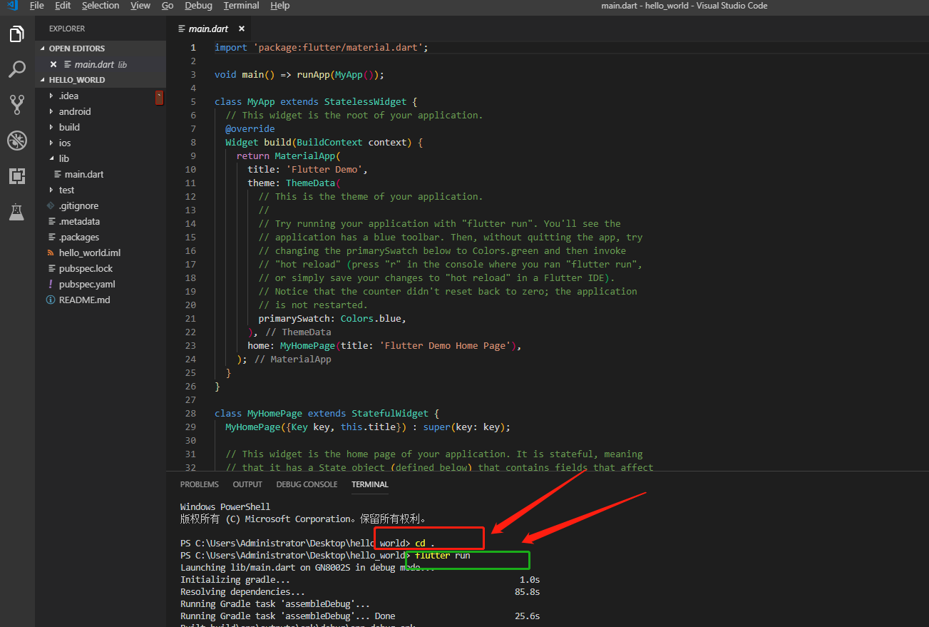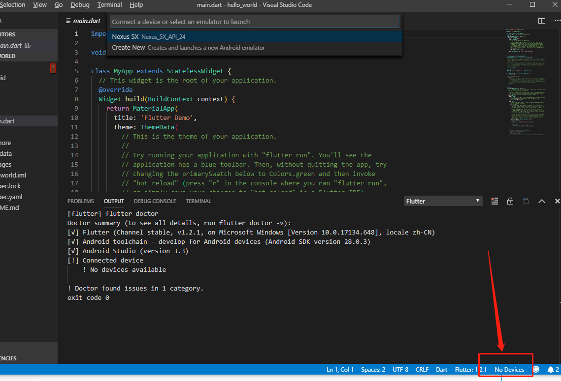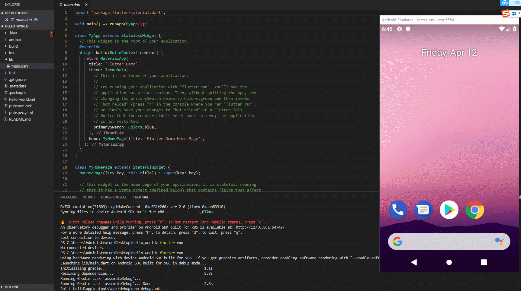 我点击的是Nexus 5X,然后我们输入flutter run,就在我们的模拟器中运行出来了项目(这个是android studio中的模拟器)