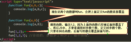 鍦ㄥ叾瀹冪紪绋嬭瑷€涓紝姣斿java锛氬鏋滀竴涓嚱鏁拌瀹氫箟杩囦袱娆★紝姣忔鍙傛暟涓暟閮戒笉鍚屻€傜浉褰撲簬瀹氫箟浜嗕袱涓笉鍚岀殑鍑芥暟锛屾牴鎹弬鏁颁釜鏁颁笉鍚岋紝浼氶€夋嫨涓嶅悓鐨勫嚱鏁版墽琛屻€侟/span>涓€涓嚱鏁板悕瀹氫箟浜嗕袱涓嚱鏁帮紝绉颁负鈥滃嚱鏁伴噸杞解€滭/strong>锛圏/span>overloaded锛夈€侟/span> 澶嶄範涓€涓嬪嚱鏁帮紝瀹氫箟鍑芥暟鏃讹紝鍙傛暟瑕佺綏鍒楀湪鍦嗘嫭鍙蜂腑锛岃繖浜涘弬鏁帮紝鍙?/span>鈥滃舰鍙傗€濓細 璋冪敤鍑芥暟鏃讹紝浼犵殑鍙傛暟鍙?/span>鈥滃疄鍙傗€濓紝JS涓嶈姹傚舰鍙傚拰瀹炲弬鏁伴噺涓€鏍峰銆侟/span> 瀹為檯涓婏紝杩欑鍙仛鏂规硶鐨勯噸杞键span style="font-family: 瀹嬩綋;">銆傚湪function fun(a,b,c){