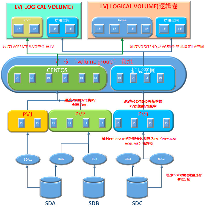 - 不同的PV加入到同一个VG中,(不同PV的PE全部进入到了VG的PE池内) #VG包含PV