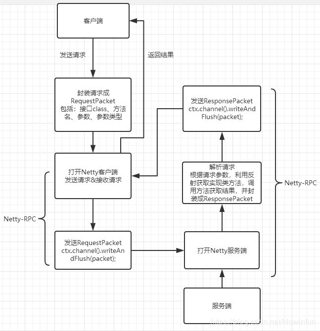 服务端:服务端的流程稍微会简单很多 1、启动Netty服务端服务,然后接收客户端的链接请求,解析请求 2、然后根据接口调用信息,利用反射获取到实现类和对应的方法,最后调用方法得到结果,然后封装一下结果就可以相应给客户端了。
