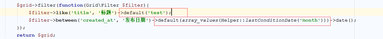 laraval-admin设置默认查询条件,在$grid->filter() 里面设置是没有用的(打开列表页面不会用到默认的查询条件)。