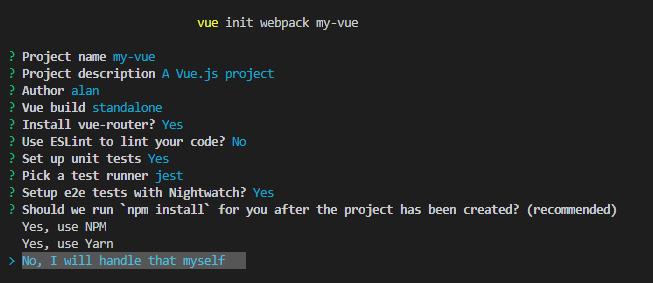 ②Should we run `npm install` for you after the project has been created?选择No, I will handle that myself ----我安装的时候,选择Yes,use Yarn最后卡在了最后一步,但是选择No以后,再自己执行yarn 就成功了。。。。