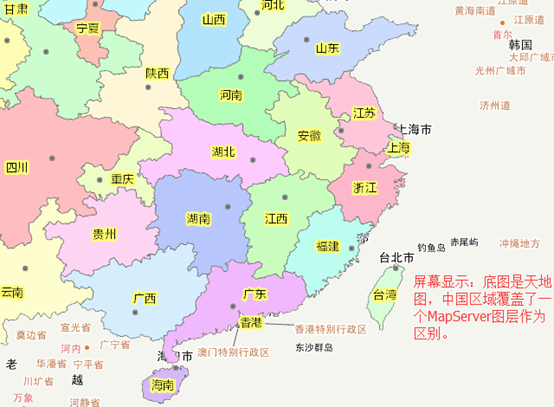 这种方法的打印对于ArcGIS Server发布的服务来讲方便好用,但是如果是调用其他地方的切片(比如通过继承WebTiledLayer调用天地图、百度地图),那么输出的会是空白。如图,底图是天地图,中国范围内叠加了一个MapServer方便区别: