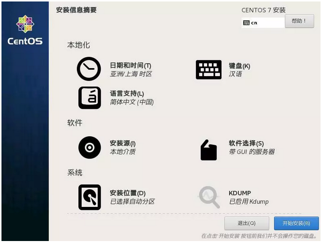 b、 安装是默认是最小安装,可选择图形界面(即带GUI的服务器)。