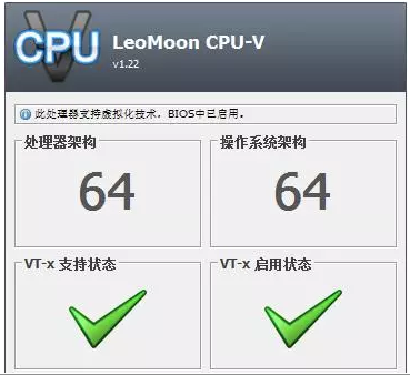 VMware安装之前首先要检查物理机是否支持虚拟化,请确保使用的物理机打开虚拟化功能(Inter VT或AMD V),如不确认可使用LeoMoon CPU-V检测,如果检测结果如下图,则表示CPU及操作系统都支持虚拟化,如果未通过,需要在BIOS中启用Intel虚拟技术,否则无法正常使用Vmware workstation。