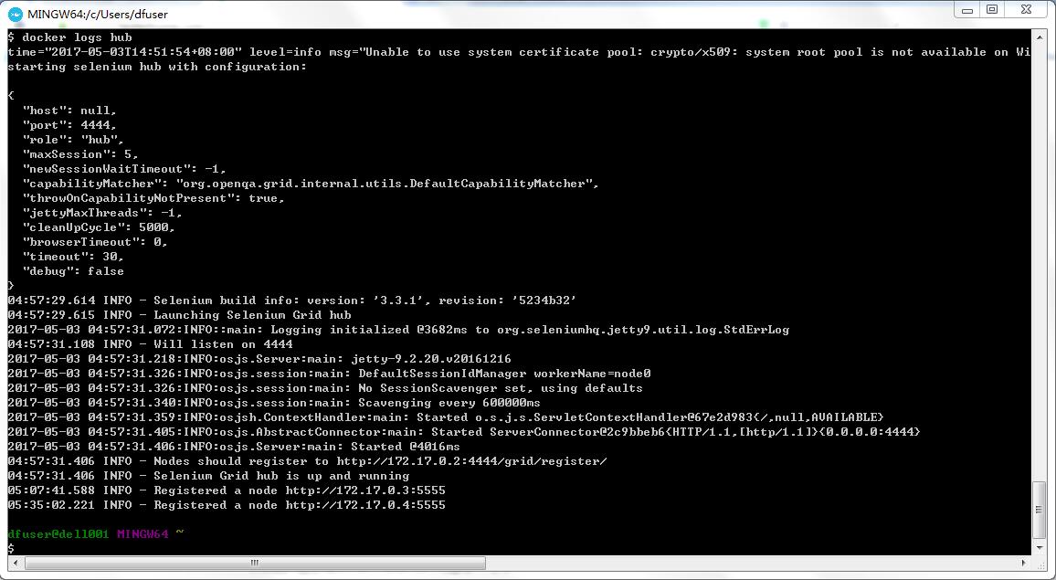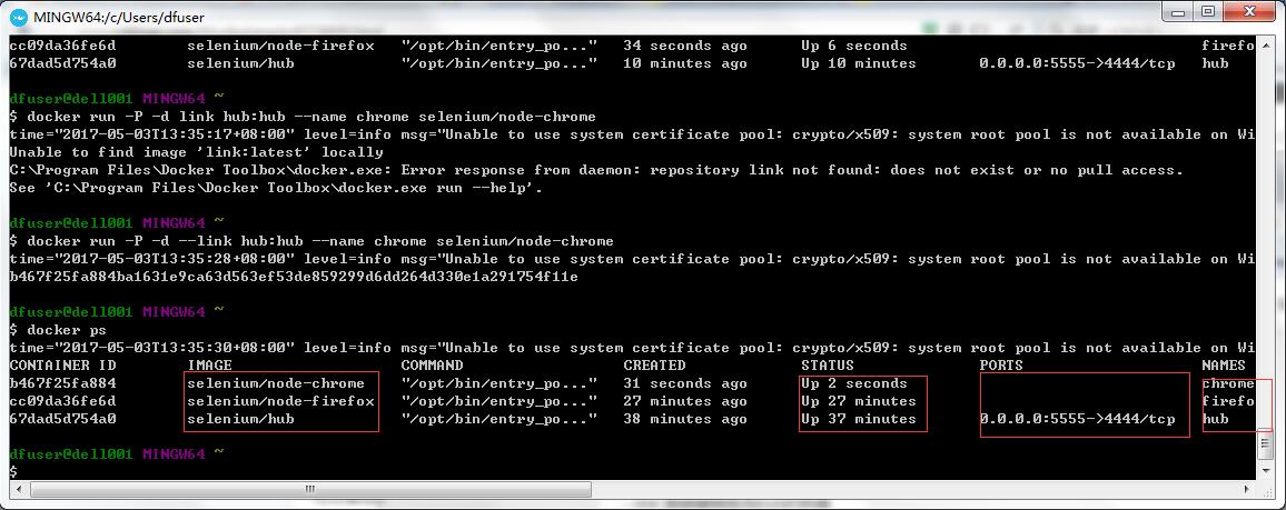 docker run -P -d --link hub:hub --name firefox selenium/node-firefox