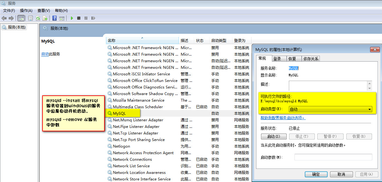 --install后面跟自定义的服务名和--defaults-file选项来指定配置文件。mysqld --install MySQL --defaults-file=E:\mysql\my.ini上述命令可以在安装时指定服务名为MySQL以及指定配置文件路径,需要注意的是:--install必须是第一个参数, 且服务名(若需指定的话)必须紧跟其后。 -
