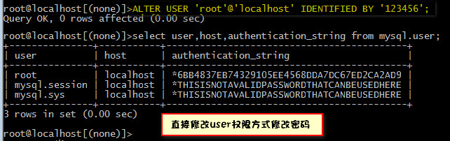重新正常登录数据库后,也可直接在mysql内直接修改用户权限或user表方式修改密码。