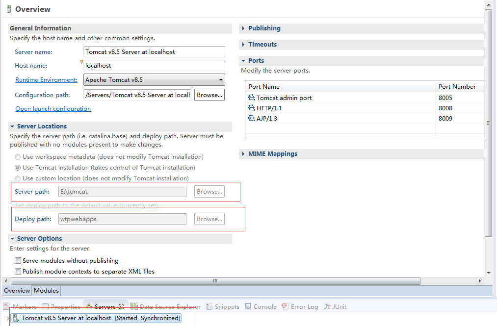 Server Path为服务器路径,Deploy path为项目的部署路径,可以看到项目Servlet2.5被部署到wtpwebapps路径下: