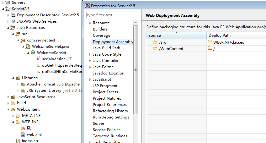 在部署项目时具体会将哪些文件复制到tomcat目录下,是通过项目Properties——>Deployment Assembly设置的(默认设置即可)。