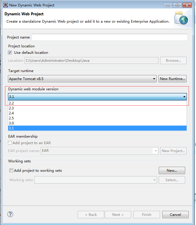 在使用Eclipse创建Dynamic Web Projcet时,有一个选项是Dynamic web module version: