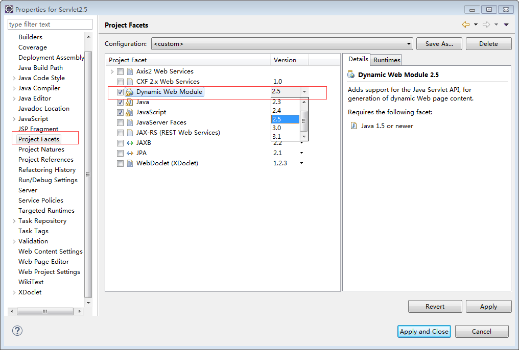 如果想将Servlet2.5升级为Servlet3.0,需要进行如下设置,右键项目Properties——>Project Facets——>Dynamic Web Dodule更改为3.0。
