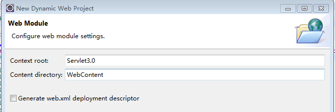首先创建一个名为Servlet3.0的Dynamic Web Projct项目,Dynamic web module version选择3.0,并且勾选上Generate web.xml deployment descriptor: