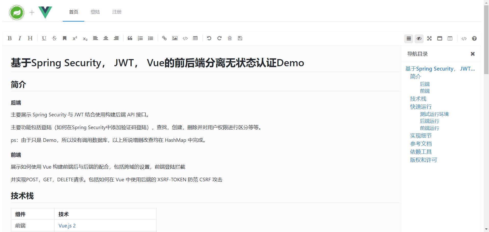 最后为了在项目的首页展示介绍,我还引入了 mavonEditor,一个基于 vue 的 Markdown 插件
