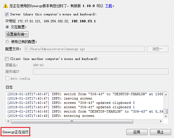 最后启动客户端,客户端正确显示“Synergy正在运行”: