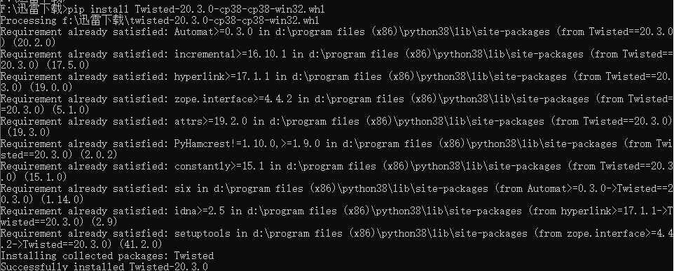 pip install Twisted-20.3.0-cp38-cp38-win32.whl pip install Scrapy