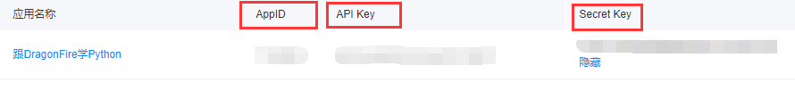 这里面有三个值 AppID , API Key , Secret Key 记住可以从这里面看到 , 在之后的学习中我们会用到
