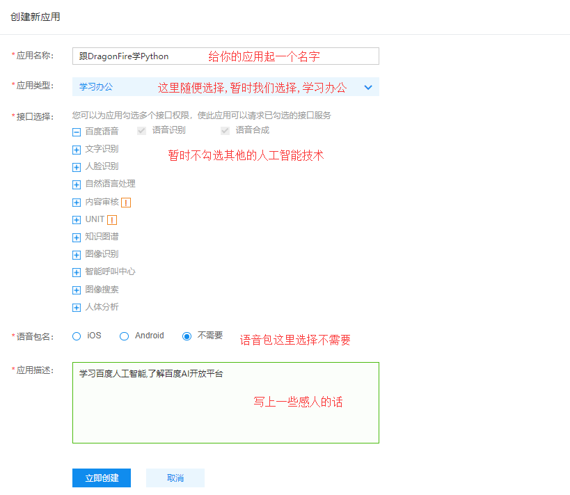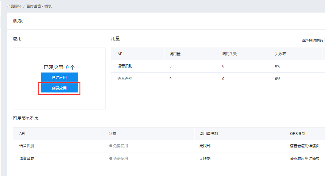 打开百度语音,进入语音应用管理界面,创建一个新的应用