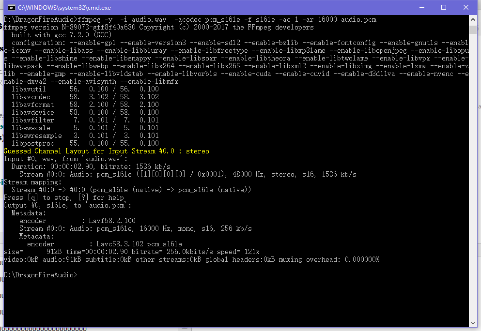然后我们用命令行对这个 audio.wav 进行pcm格式的转换然后得到 audio.pcm