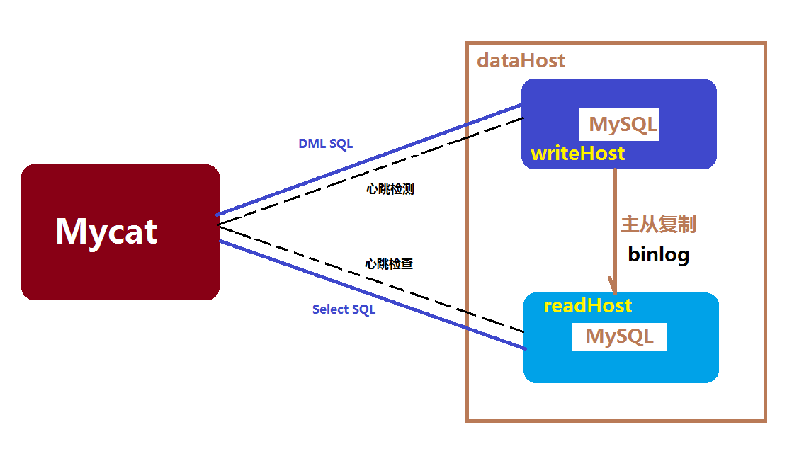 MyCAT心跳检查语句配置为 show slave status ,dataHost 上定义两个新属性: switchType="2" 与 slaveThreshold="100",此时意味着开启MySQL主从复制状态绑定的读写分离与切换机制,Mycat心跳机制通过检测 show slave status 中的 "Seconds_Behind_Master", "Slave_IO_Running", "Slave_SQL_Running" 三个字段来确定当前主从同步的状态以及Seconds_Behind_Master主从复制时延, 当Seconds_Behind_Master>slaveThreshold时,读写分离筛选器会过滤掉此Slave机器,防止读到很久之前的旧数据,而当主节点宕机后,切换逻辑会检查Slave上的Seconds_Behind_Master是否为0,为0时则表示主从同步,可以安全切换,否则不会切换。