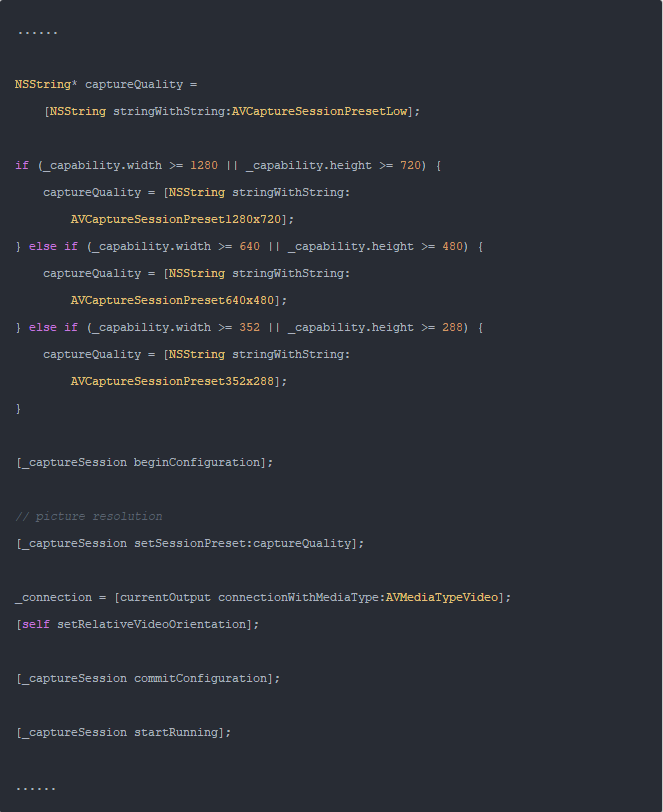 在 WebRTC 的 modules/video_capture/objc/rtc_video_capture_objc.mm 文件中实现了iOS视频采集相关的工作: