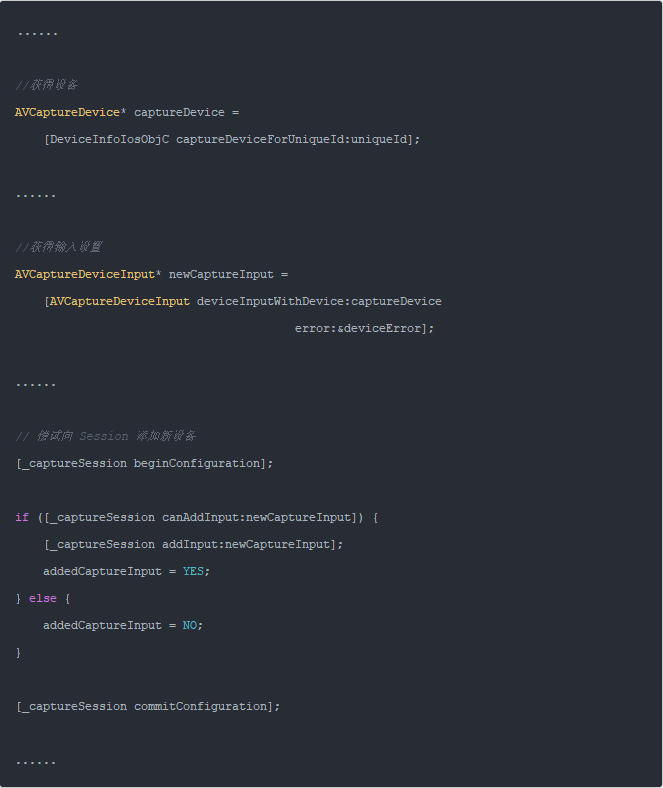 - 将 AVCaptureDeviceInput 对像添加到 AVCaptureSession 对象中。
