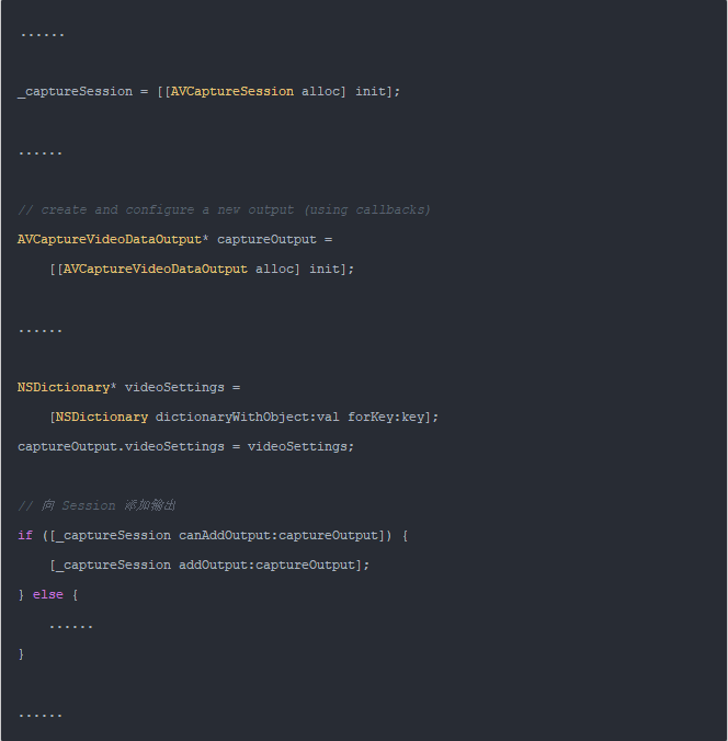 - 将 AVCaptureVideoDataOutput 对象添加到 AVCaptureSession对象中。