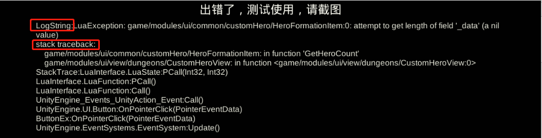 2.堆栈日志界面:ERROR时弹出界面,该界面显示错误的堆栈日志。大半部分错误日志是不会导致崩溃,如果不弹窗qa可能会漏掉一些重要的log信息。