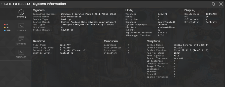 SRDebugger界面示例:SRDebugger可以获取当前运行系统的信息,包括操作系统、处理器、显卡等硬件信息。