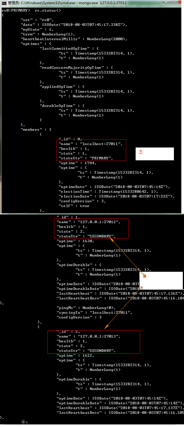 6>刚说副本集是没有主节点的集群,主节点宕机后其他节点会自动切换回来,下面我模拟这种场景,把27011干掉: