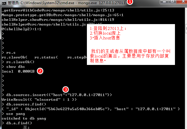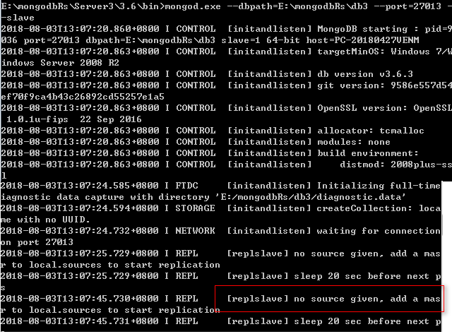 启动mongodb,不指定主库:mongod.exe --dbpath=E:\mongodbRs\db3 --port=27013 --slave