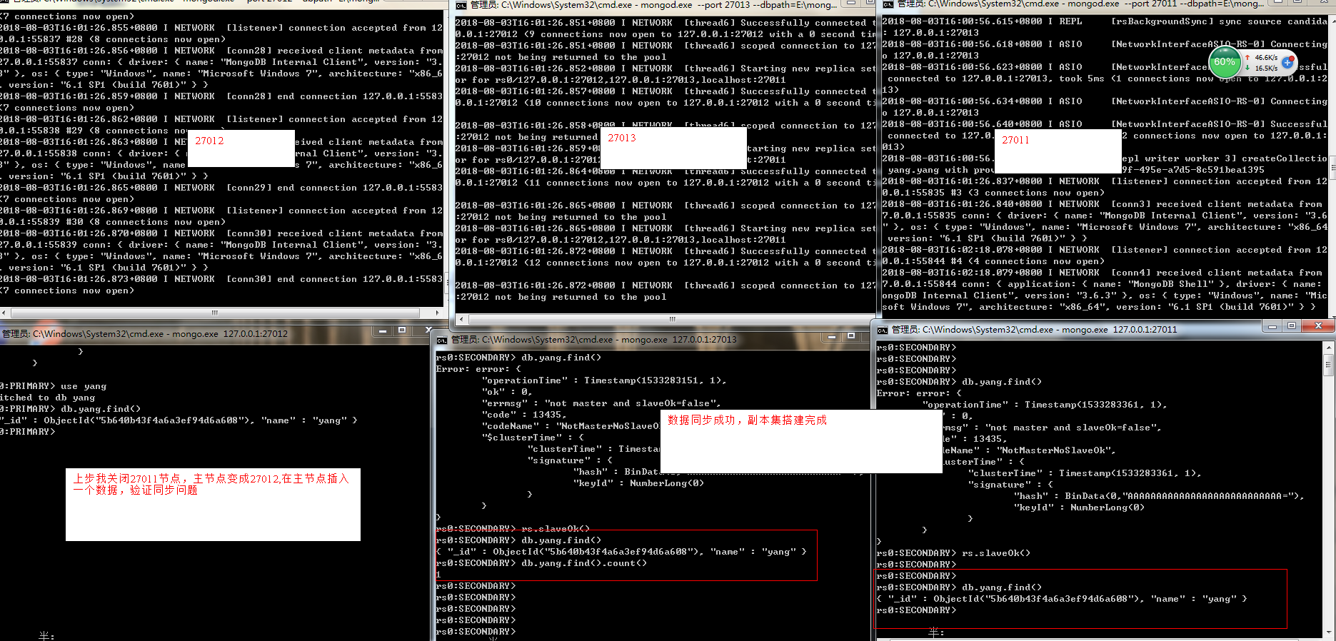 至此,mongodb的主从复制和副本集的搭建已经全部完成,不会的搭建可以参考:http://www.runoob.com/mongodb/mongodb-replication.html
