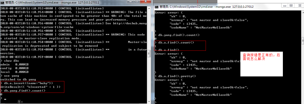 这种手段在大一点的架构中都有实现,在mongodb中其实很简单,在默认的情况下,从属数据库不支持数据的读取,但是没关系,