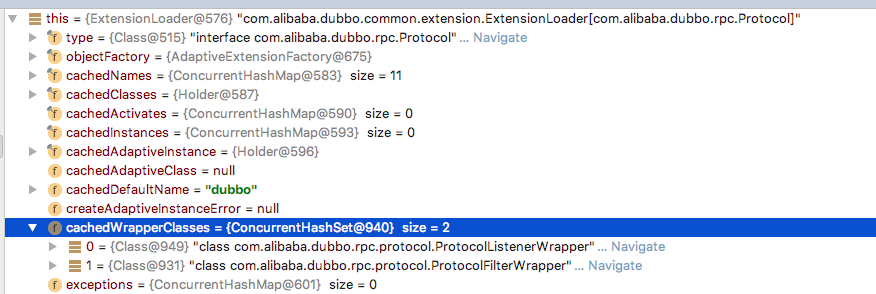 - Dubbo的设计中用到了大量的全局缓存,所有的Extension都缓存在cachedInstances中,该对象类型为ConcurrentMap<String, Holder<Object>>