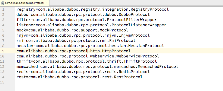 - 文件名称和接口名称保持一致,文件内容为key=vaule的形式xxx=com.alibaba.xxx.XxxProtocol</br>