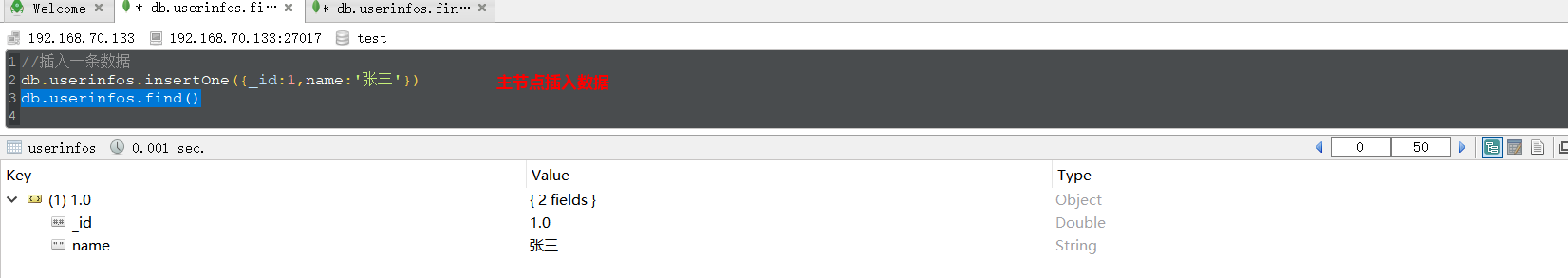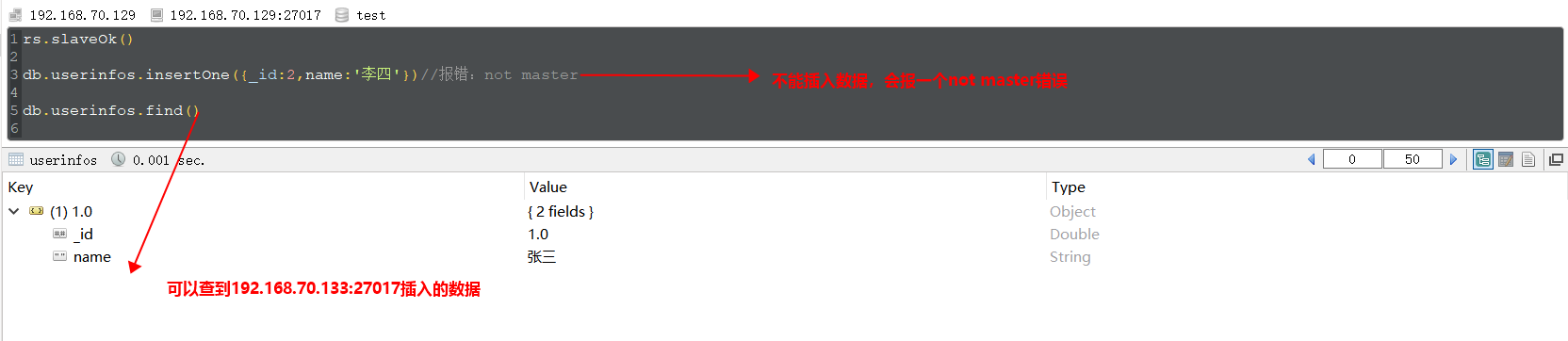 首先添加一些测试数据:连接主节点192.168.70.129:27017,执行以下命令插入一些测试数据,接着到两个从节点分别执行命令 rs.slaveOk() 让节点可以进行read操作: