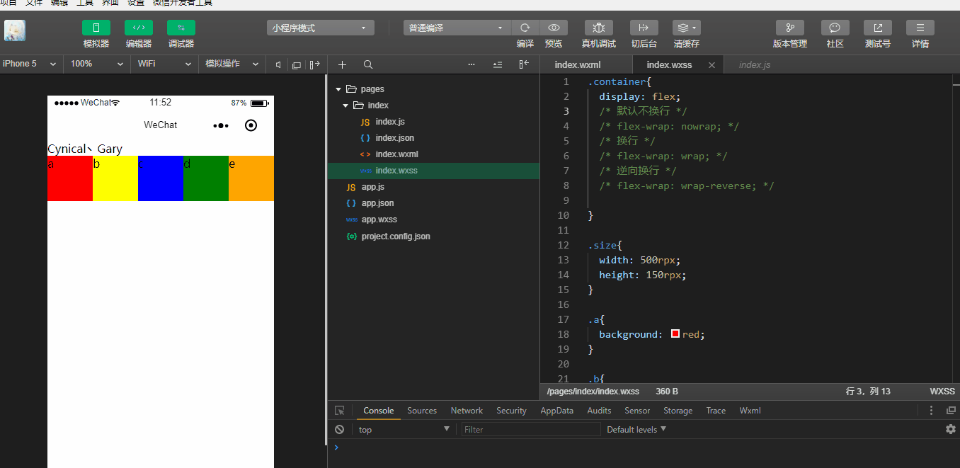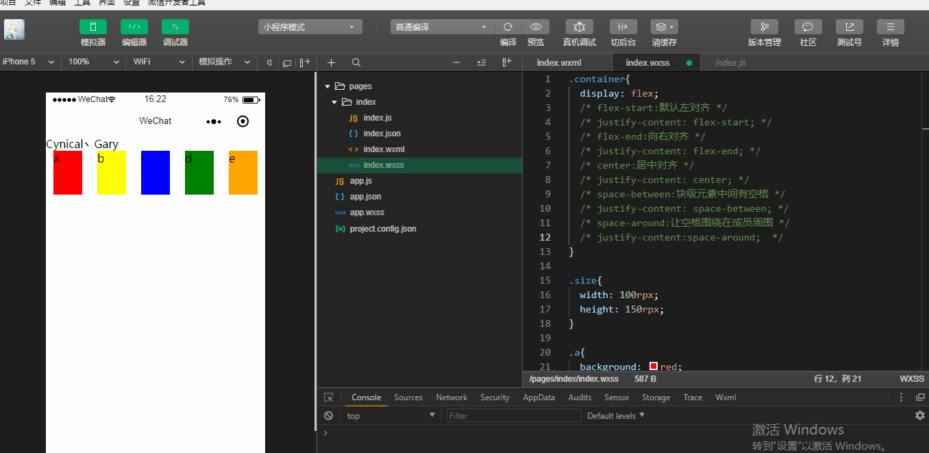 index.html中定义五个<view>分别加上a、b、c、d、e五个文本标签,微信小程序中默认flex-direction:row