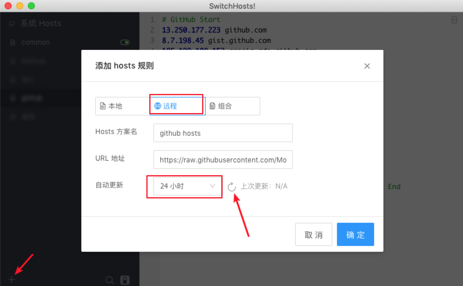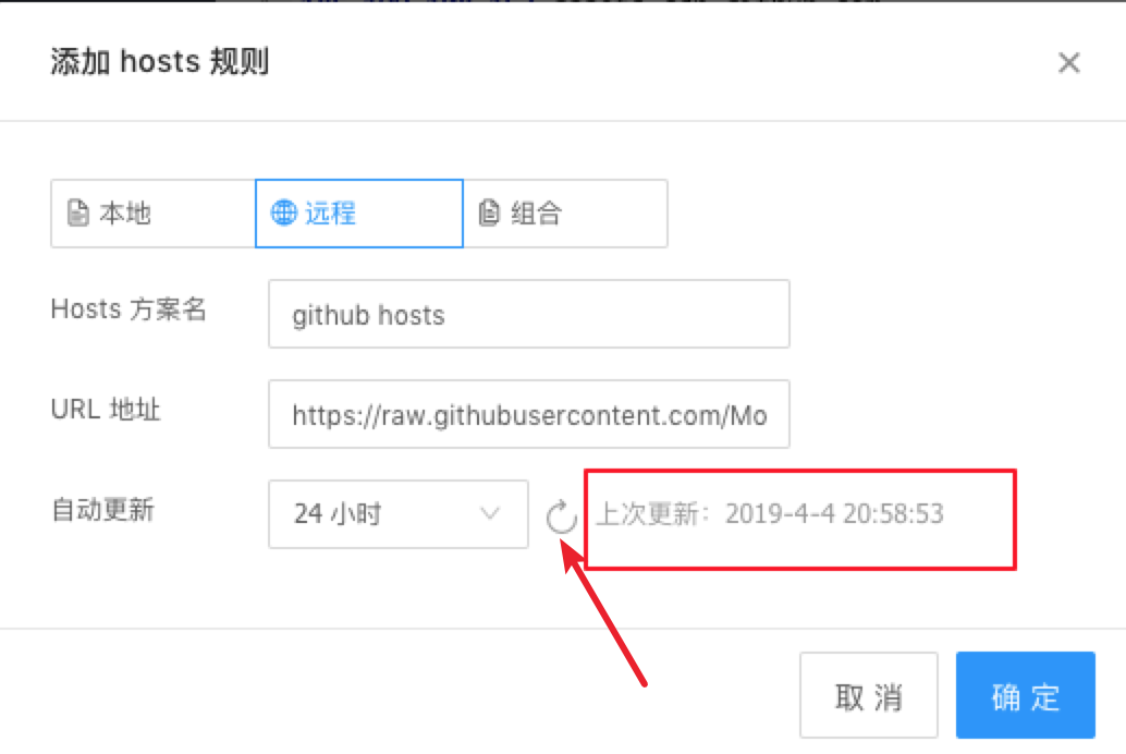 - 设置自动更新 选择 24 小时即可,第一次添加的时候需要手动点击刷新按钮,刷新获取一下远程的 hosts