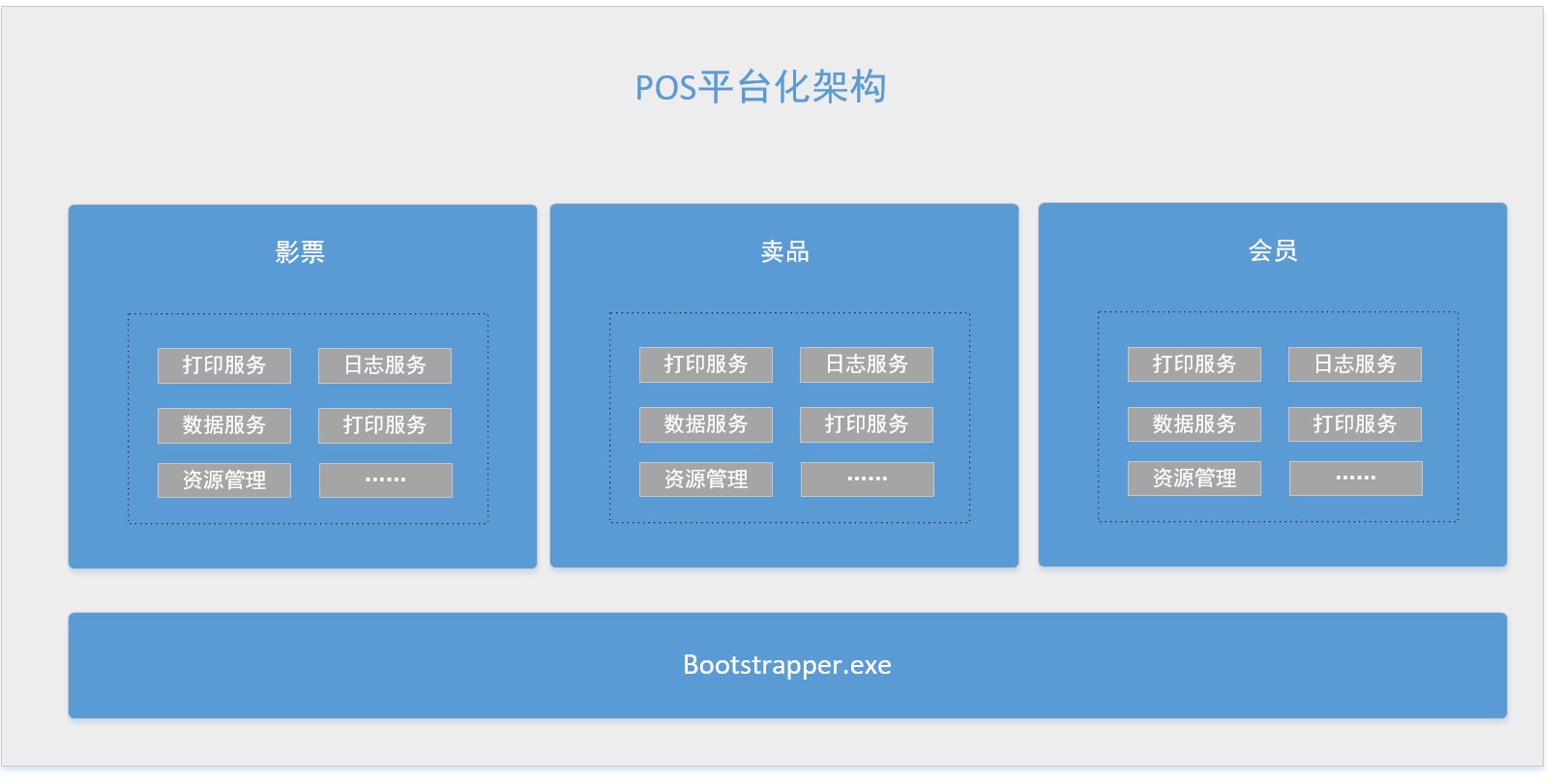 POS是给前台售票员使用的系统,业务上相对简单,大部分都是与顾客相关,可粗略分为影票,卖品,会员三大类,还有打印,读卡等硬件交互模块,另外还有登录,客屏这些功能,抽钞,赠券等归类为其他业务。
