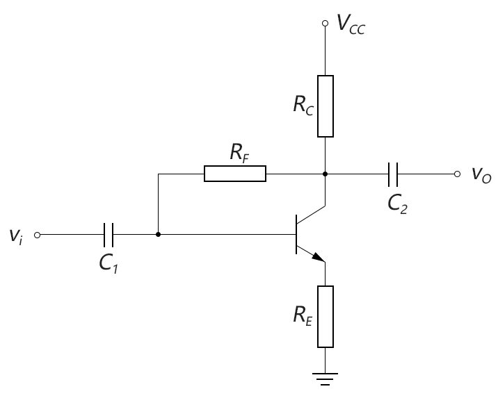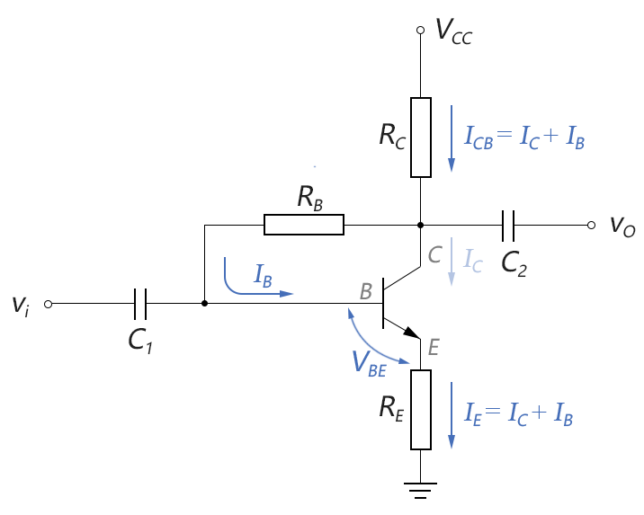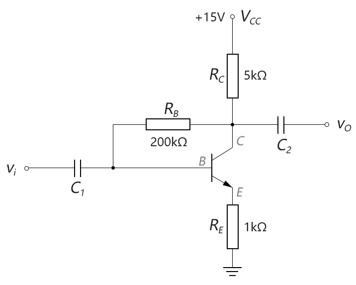 也就是说,仅仅为了维持这个分压点,就要消耗一个毫安级的功耗,这是非常不划算的,因此人们又设计出了集电极反馈偏置(collector feedback configuration)电路,这个电路的静态功耗比分压偏置小,但是稳定性会有一点点受β参数影响,也就是说,性能介于“分压偏置”和“改进的固定偏置”之间,算是一个折中方案吧。电路图如下所示: