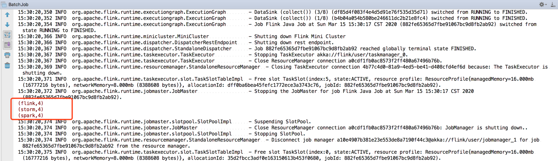 然后,使用 fromElements 函数创建一个 DataSet 对象,该对象中包含了我们的输入,使用 FlatMap、GroupBy、SUM 函数进行转换。