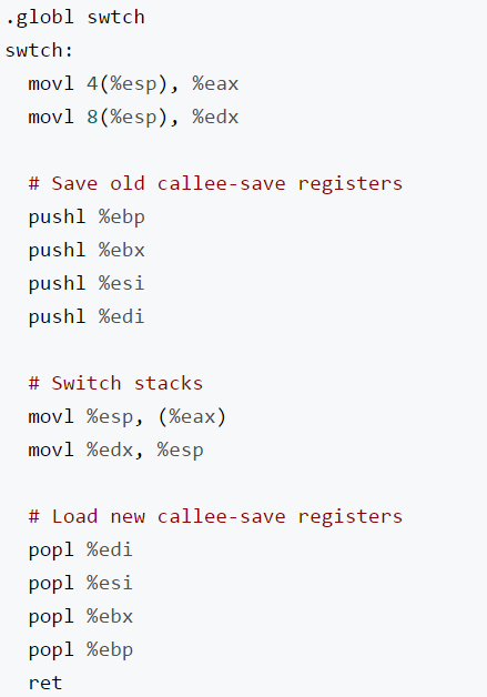 swatch函数任务:1. 保存当前(old)进程的上下文。 2. 加载新进程(new)的上下文到机器寄存器中。