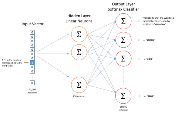 神经网络的训练是有监督的学习,因此要给定输入值和输出值来训练神经网络,而我们最终要获得的是隐藏层的权重矩阵。因为隐藏层的输出事实上是每个输入单词的 “嵌入词向量”。我们来看个图