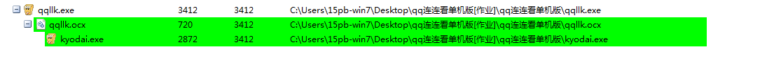一共创建了三个进程,分别对应qqllk.exe -> qqllk.ocx -> kyodai.exe 程序。