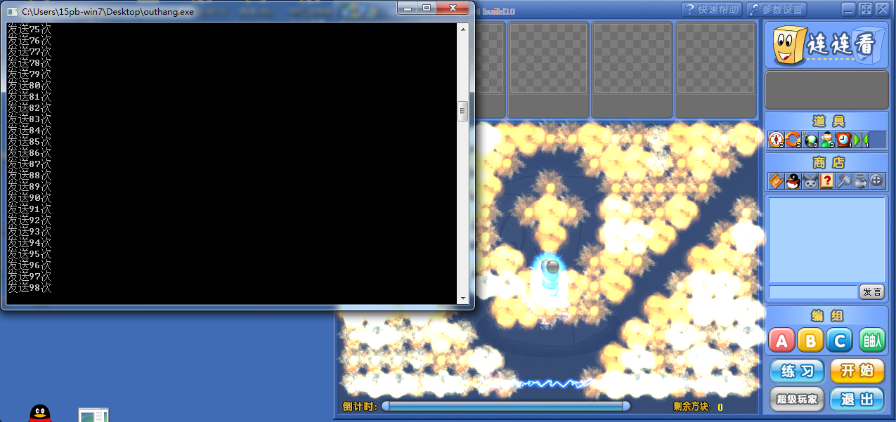 //实现代码: //找到进程 HANDLE ReProcess = 0; PROCESSENTRY32 pe32; pe32.dwSize = sizeof(pe32); HANDLE hProcessSnap = CreateToolhelp32Snapshot(TH32CS_SNAPPROCESS, 0); BOOL bMore = ::Process32First(hProcessSnap, &pe32); //多字节转宽字节 WCHAR proname[10] = {}; MultiByteToWideChar(CP_ACP, MB_COMPOSITE, "kyodai.exe", 10, proname, 10); while (bMore) { if (wcscmp(pe32.szExeFile, proname) == 0) { ReProcess = ::OpenProcess(PROCESS_ALL_ACCESS, FALSE, pe32.th32ProcessID); break; } bMore = Process32Next(hProcessSnap, &pe32); } //修改指令 DWORD attibute; VirtualProtectEx(ReProcess, (LPVOID)0x0041de2e, 0x7, PAGE_READWRITE, &attibute); //cmp bl,0x0 BYTE OPecode1[] = { '\x66', '\xc7', '\x40', '\x01', '\xf4', '\x99' ,'\x90' }; DWORD num; WriteProcessMemory(ReProcess, (LPVOID)0x0041de2e, OPecode1, 7, &num); VirtualProtectEx(ReProcess, (LPVOID)0x0041de2e, 0x7, attibute, &attibute); CloseHandle(ReProcess); HWND window = FindWindowA(NULL, "QQ连连看"); //发送模拟点击消息 for (int i = 0; i < 100; i++) { Sleep(50); PostMessage(window, WM_LBUTTONDOWN, MK_LBUTTON, MAKELPARAM(681, 200)); printf("发送%d次\n", i); } ////完成五、效果