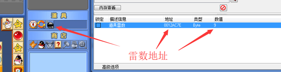 用CE附加进程,找到道具列表的雷数 数据地址,