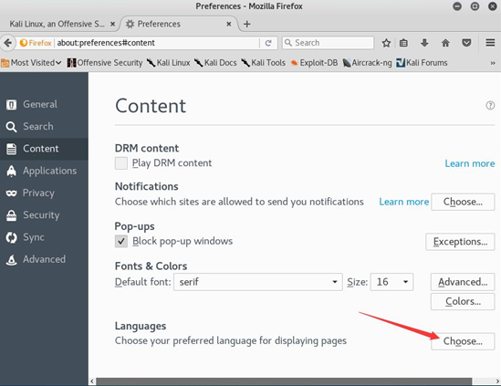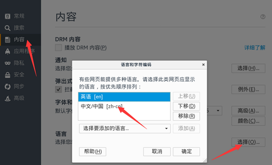 3、 选择“内容”-->在语言栏点击“选择”,选择“中文/中国 [zh-cn]”,点击“确定”,重启浏览器即可。