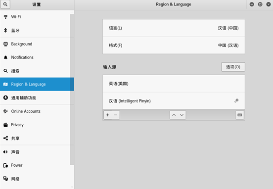 然后重启操作系统,点击桌面右上角的设置>区域和语言,在输入源中添加汉语(拼音)即可: